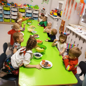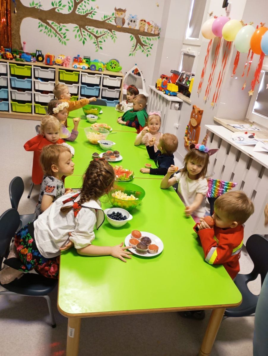 Po intensywnej zabawie przyszedł czas na poczęstunek, który przygotowali rodzice. Na dzieci czekały smaczne przekąski i napoje, które dodały im energii do dalszej zabawy.