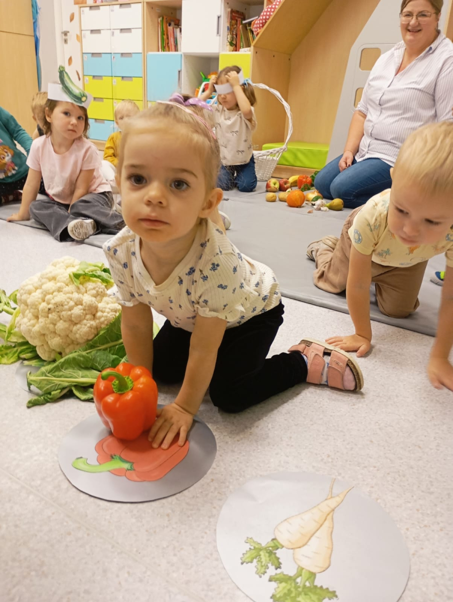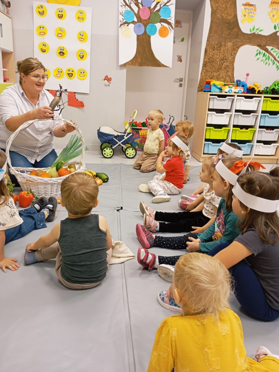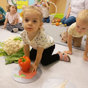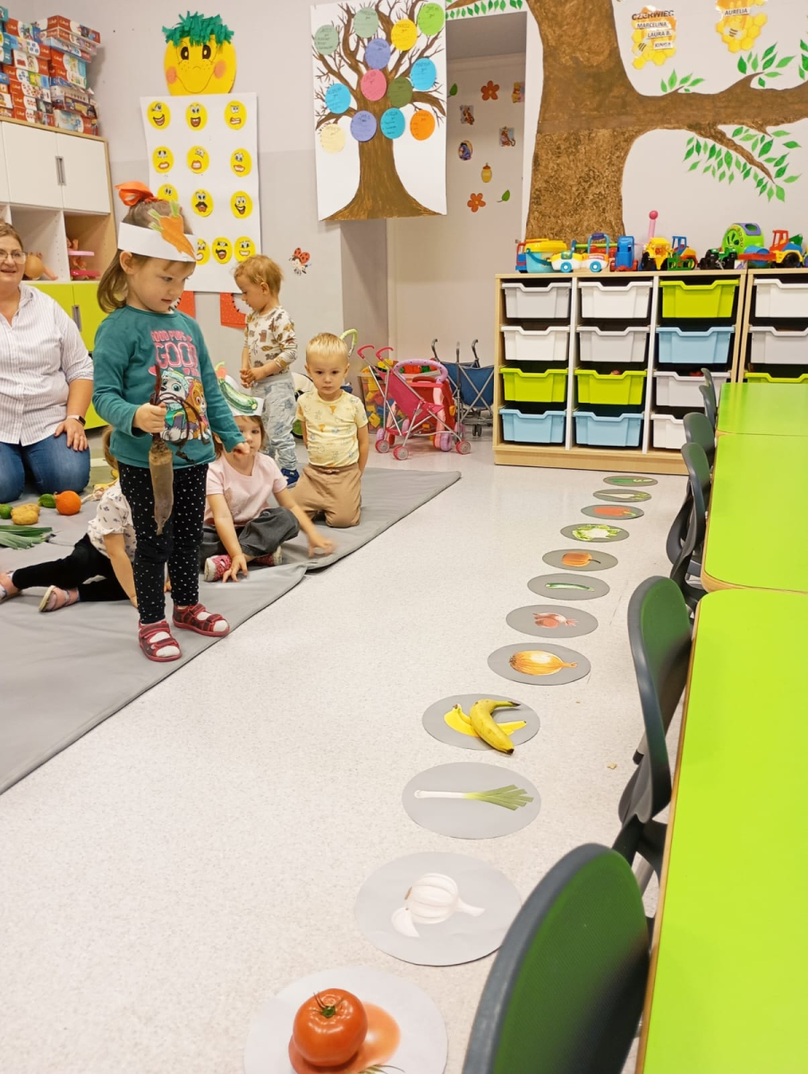 17 października wraz z Biedronkami obchodziliśmy Dzień Owoców i Warzyw. W tym dniu uświadamialiśmy maluchom, jak ważną rolę w naszym życiu spełniają owoce i warzywa. Na dzieci czekał ogromny kosz wypełniony przeróżnymi produktami. Dzieci odgadywały nazwy, dotykały i wąchały, a następnie segregowały, czy dany produkt należy do grupy owoców czy warzyw. Kolejnym zadaniem było odłożenie warzywa bądź owocu na kartę z tym samym symbolem.