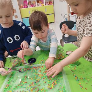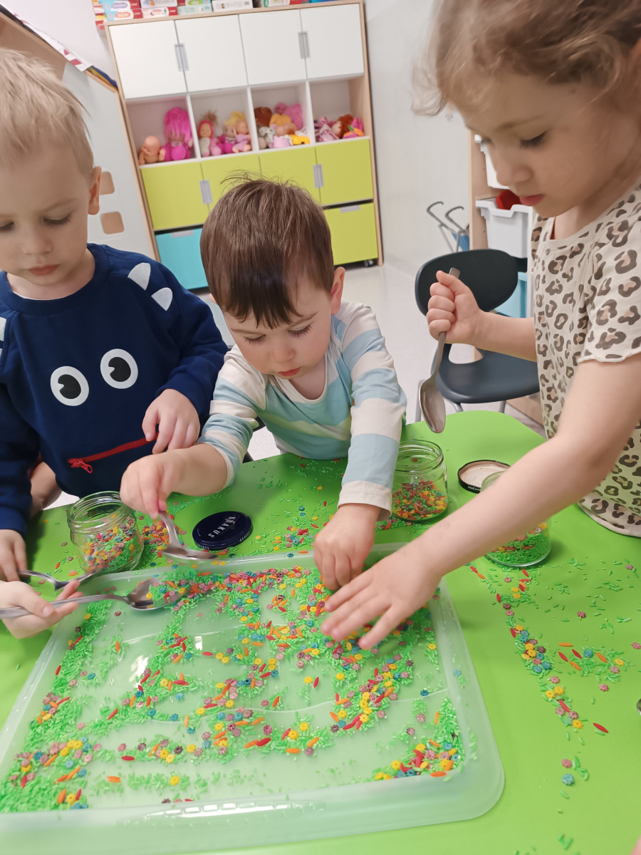Dużo radości przyniosły również zajęcia sensoryczne. Maluchy tworzyły "wiosenną łąkę w słoiku", wykorzystując kolorowy ryż i makaron. Dzieci mogły dotykać, przesypywać i eksperymentować z różnymi fakturami, rozwijając swoje zmysły oraz wyobraźnię.