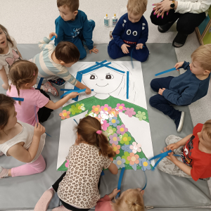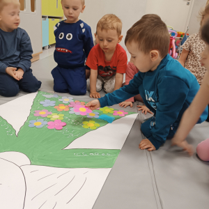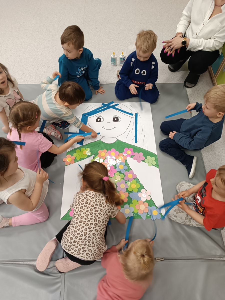 Nie zabrakło także twórczej pracy plastycznej. Dzieci wspólnie zdobiły suknie Pani Wiosny kolorowymi kwiatami i motylami, dzięki czemu powstało wyjątkowe dzieło.
