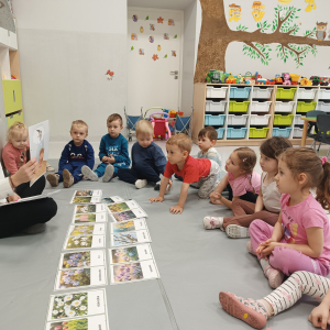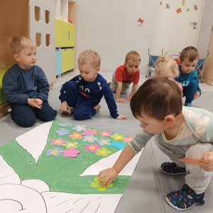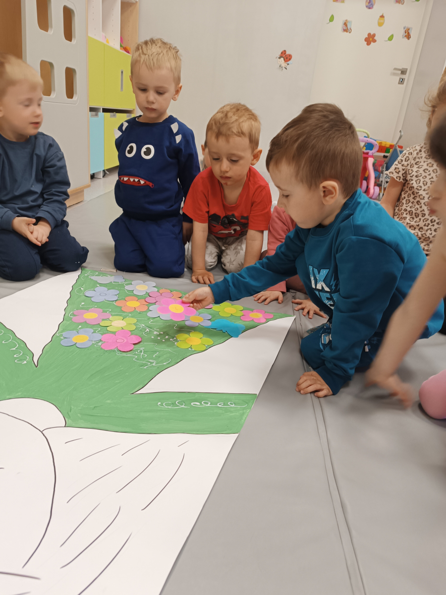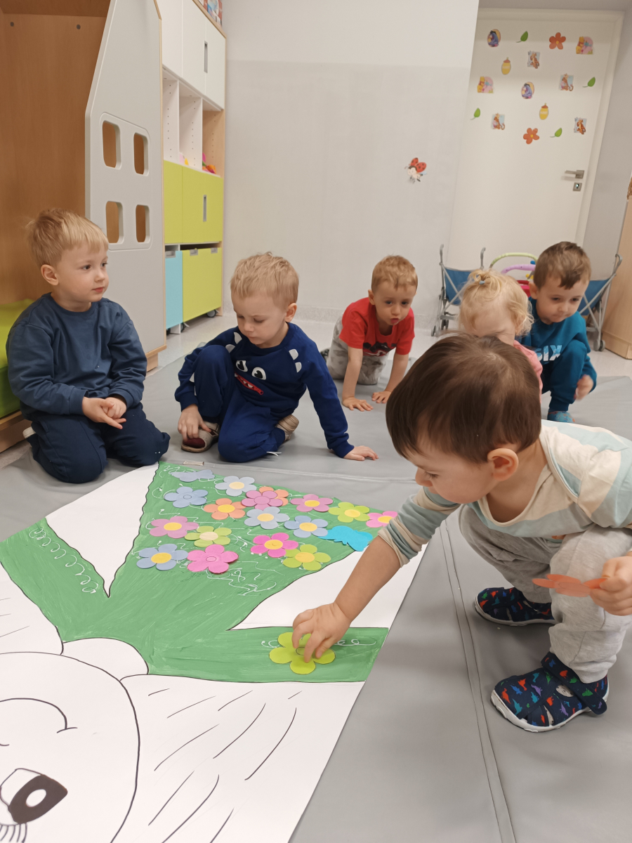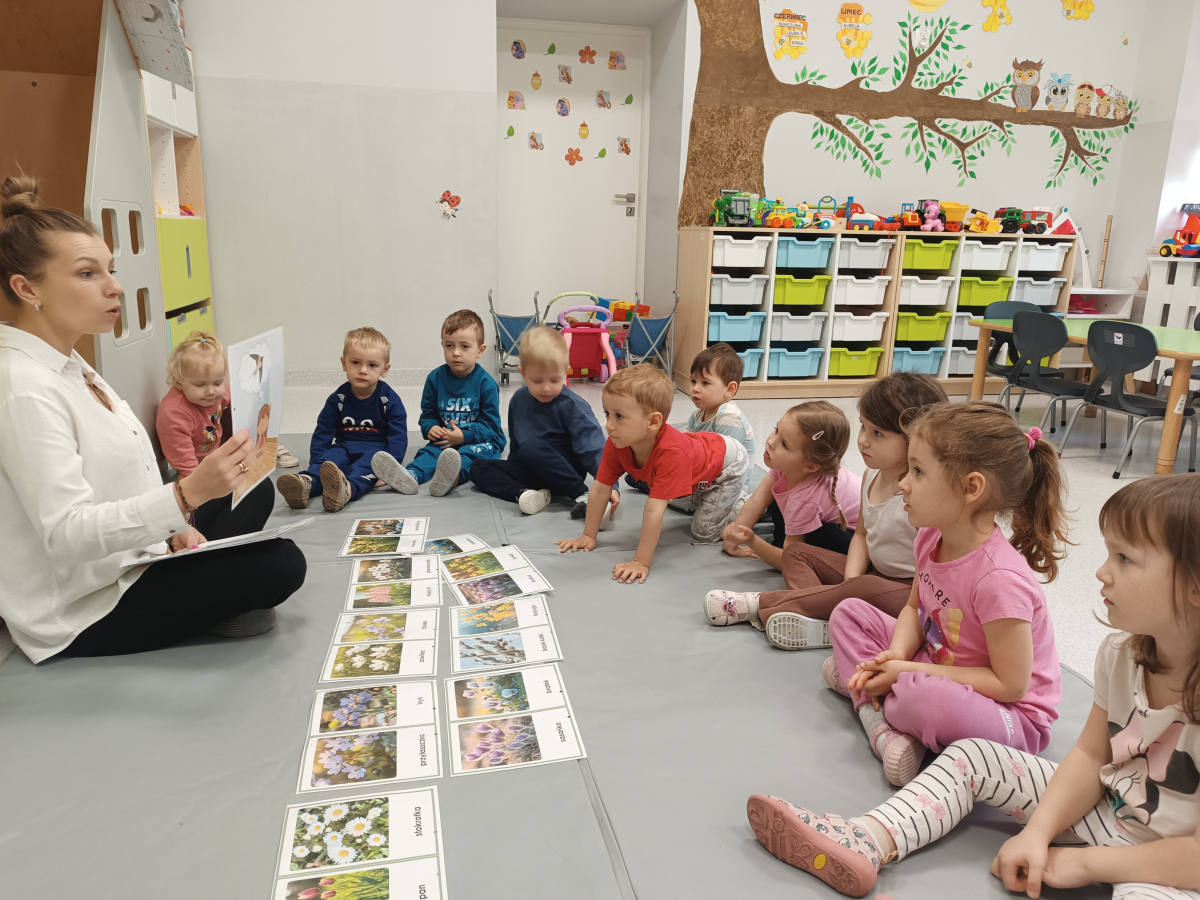 Podczas zajęć dzieci wysłuchały historyjki obrazkowej o zwiastunach wiosny. Wspólnie rozmawialiśmy o tym, jakie zmiany zachodzą w przyrodzie, jakie zwierzęta się budzą oraz jakie kwiaty pojawiają się jako pierwsze. Maluchy z dużym zainteresowaniem oglądały również zdjęcia wiosennych kwiatów, poznając ich kolory i nazwy.