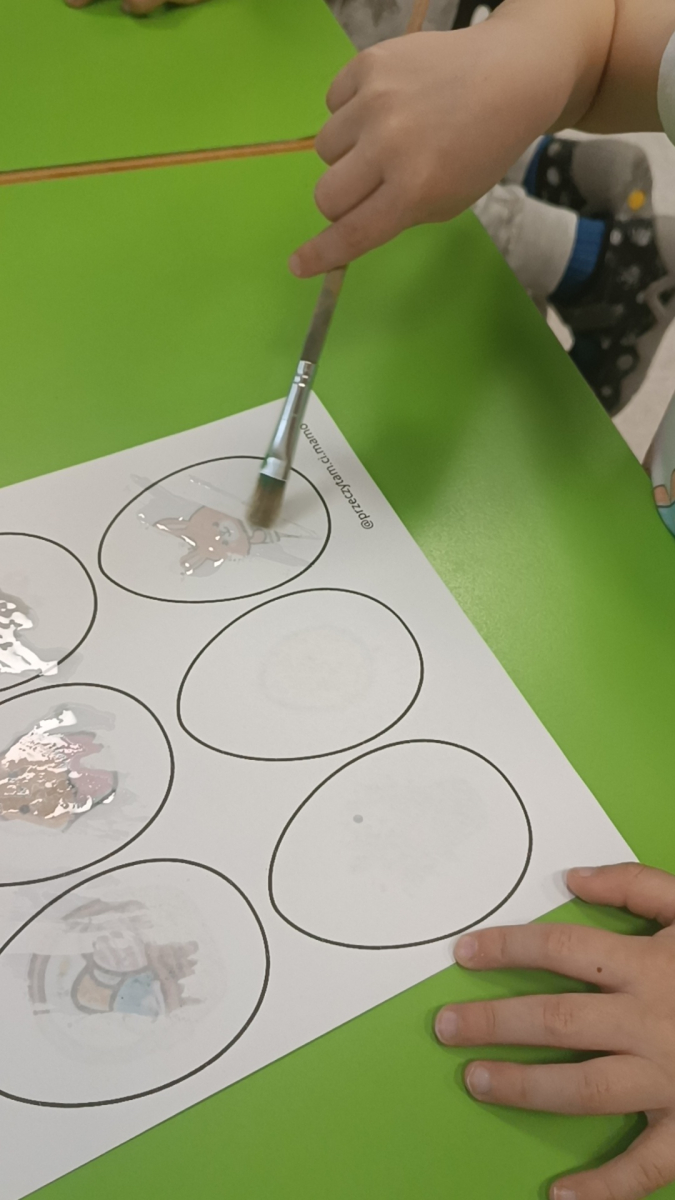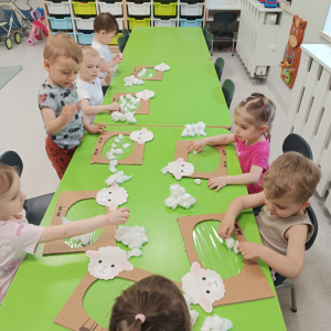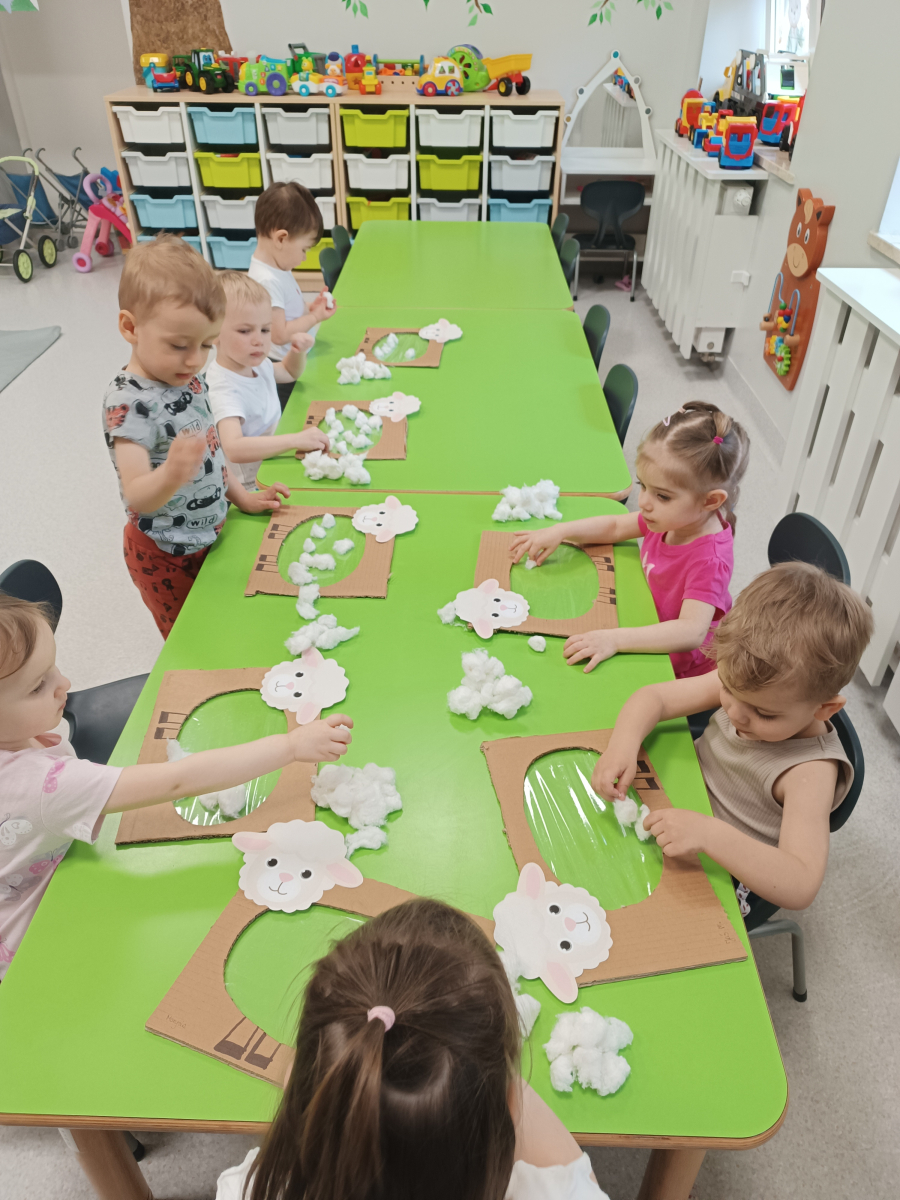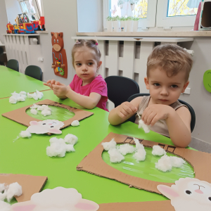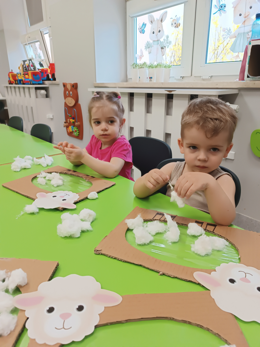 Nie zabrakło również zajęć plastycznych. Dzieci wyklejały baranki miękką watą, tworząc urocze, puszyste prace. Jednym z zadań było ozdabianie pisanek kolorowym konfetti - mali artyści z wielkim zaangażowaniem dobierali kolory i wzory, rozwijając swoją wyobraźnię i zdolności manualne.