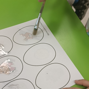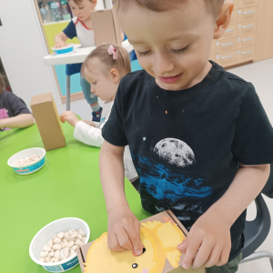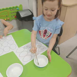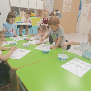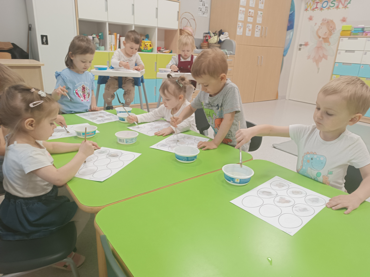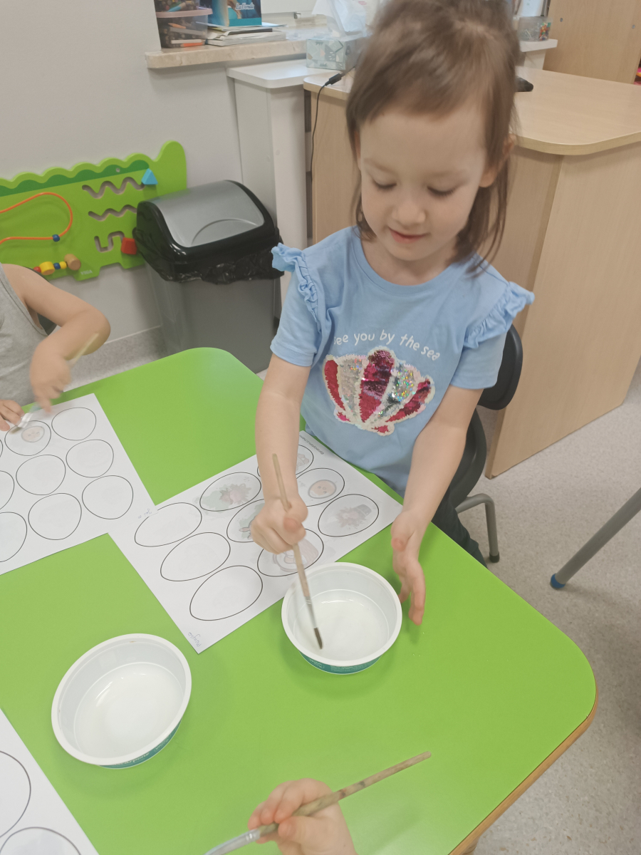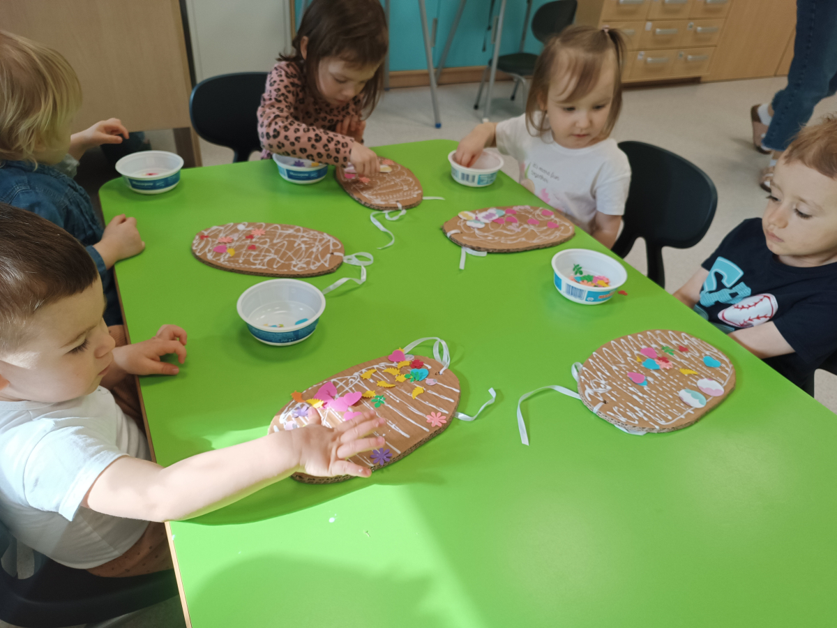 Nie zabrakło również zajęć plastycznych. Dzieci wyklejały baranki miękką watą, tworząc urocze, puszyste prace. Jednym z zadań było ozdabianie pisanek kolorowym konfetti - mali artyści z wielkim zaangażowaniem dobierali kolory i wzory, rozwijając swoją wyobraźnię i zdolności manualne.