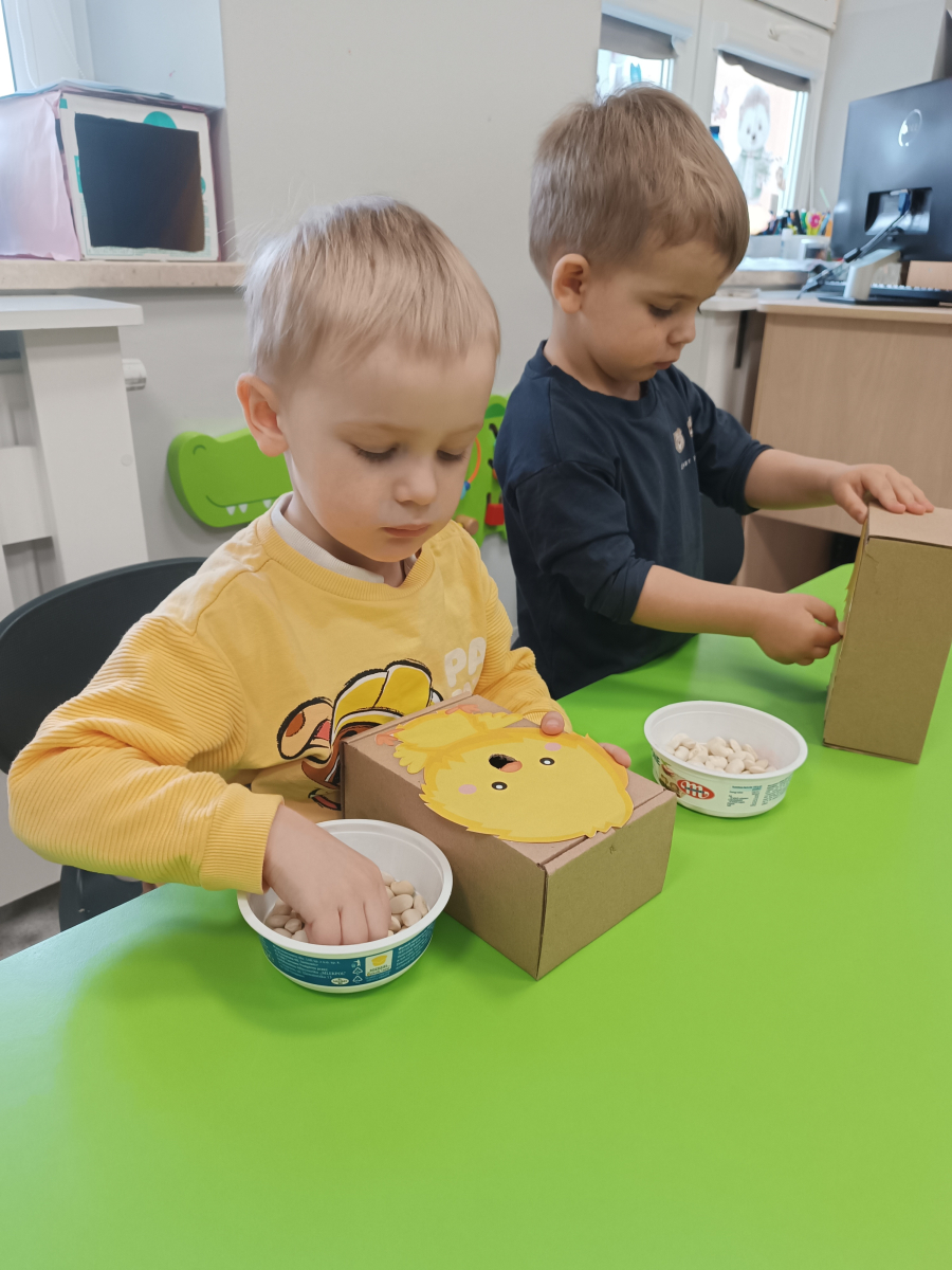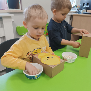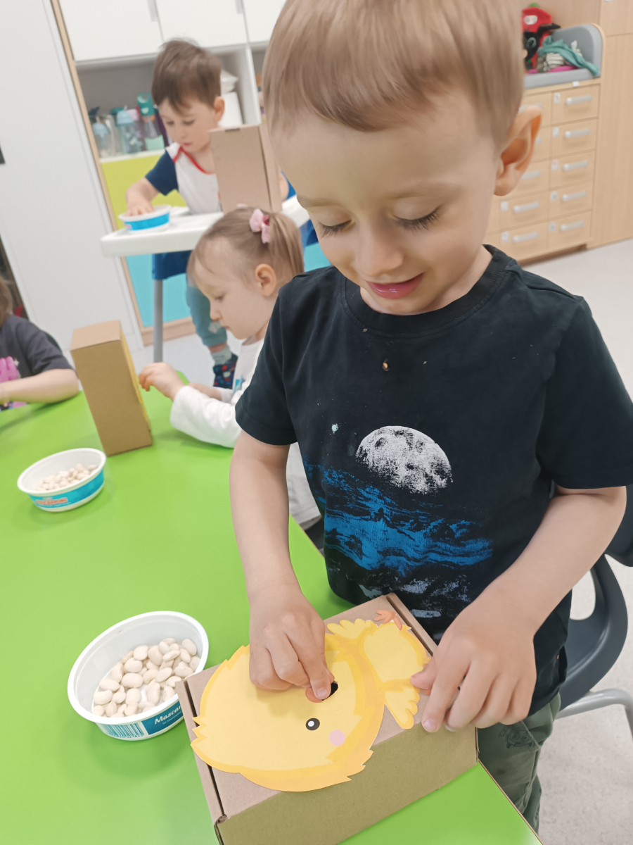 Rozmawialiśmy o tym co kojarzy nam się z tymi świętami czyli kurczaki, baranki, pisanki, koszyczek wielkanocny, zajączki. Dzieci super spędziły czas przy "karmieniu" sensorycznych kurczaczków.